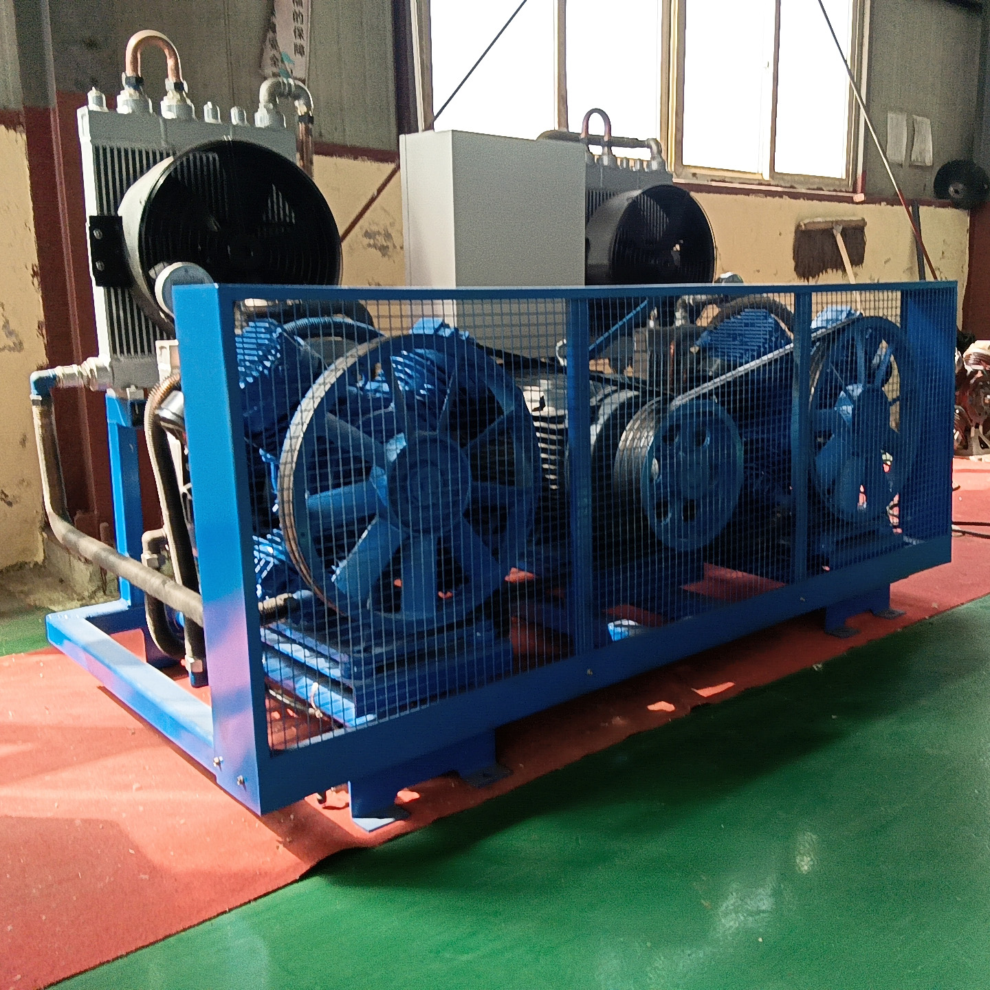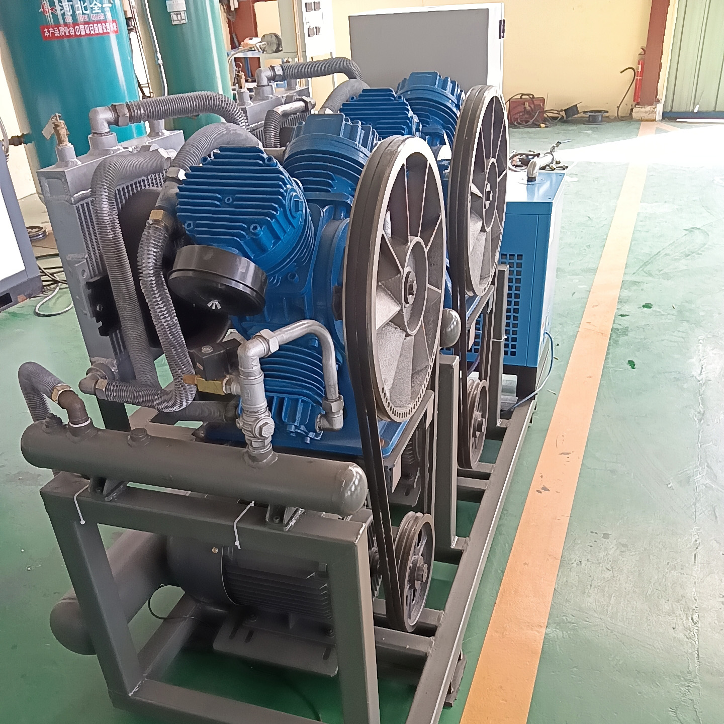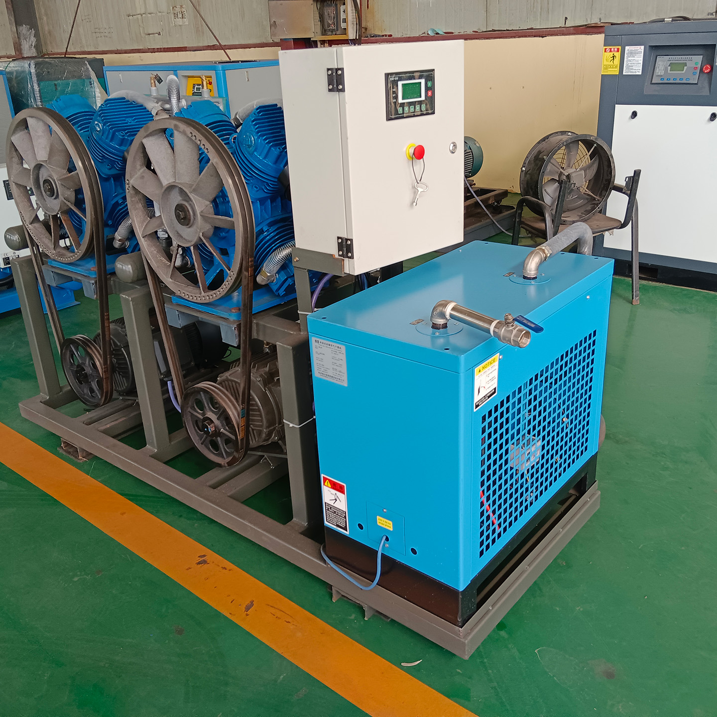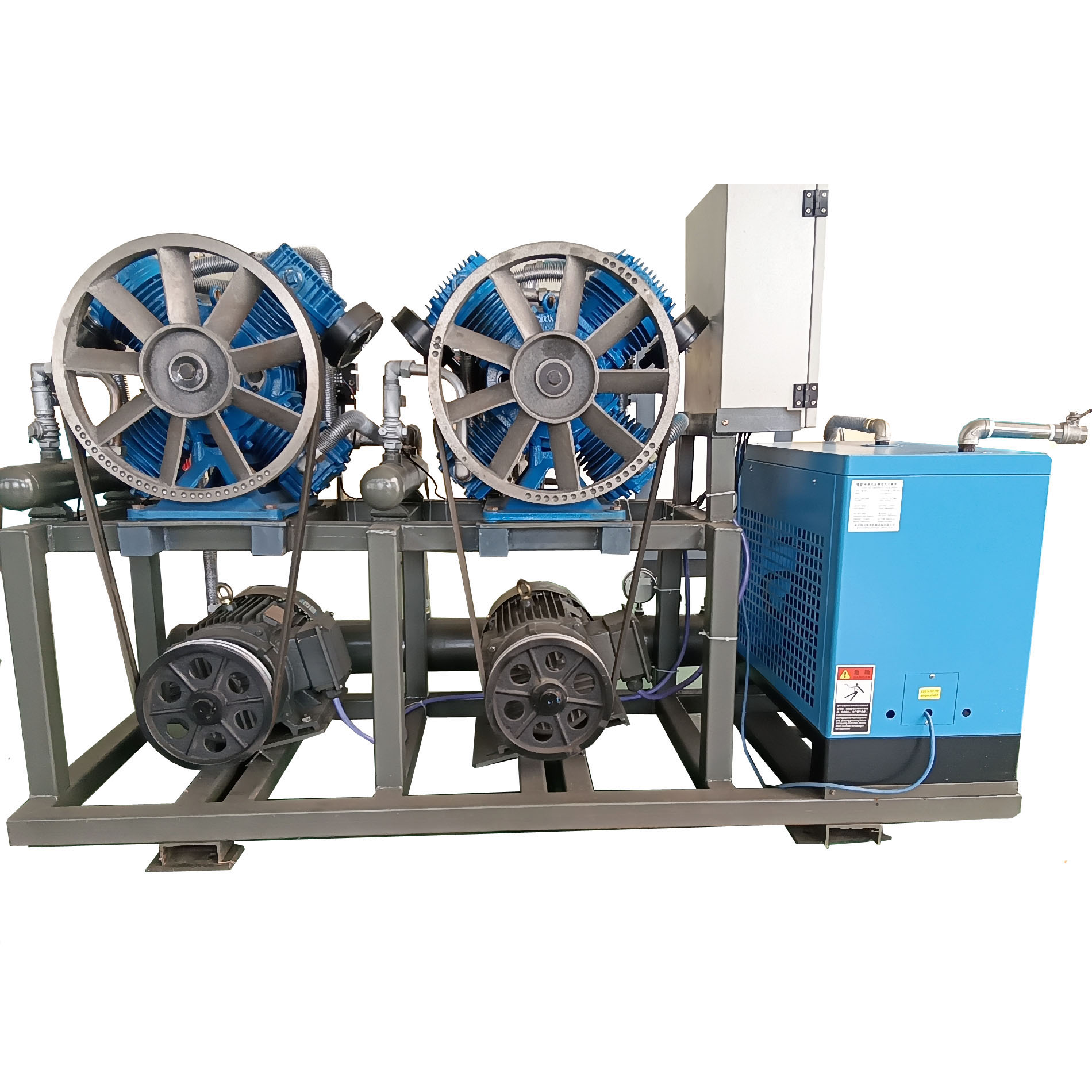 此款双主机无油空压机为实用型,它无静音机箱,但是包含:主机、0.6m³立式储气罐、冷干机、过滤器等,采用分体安装。